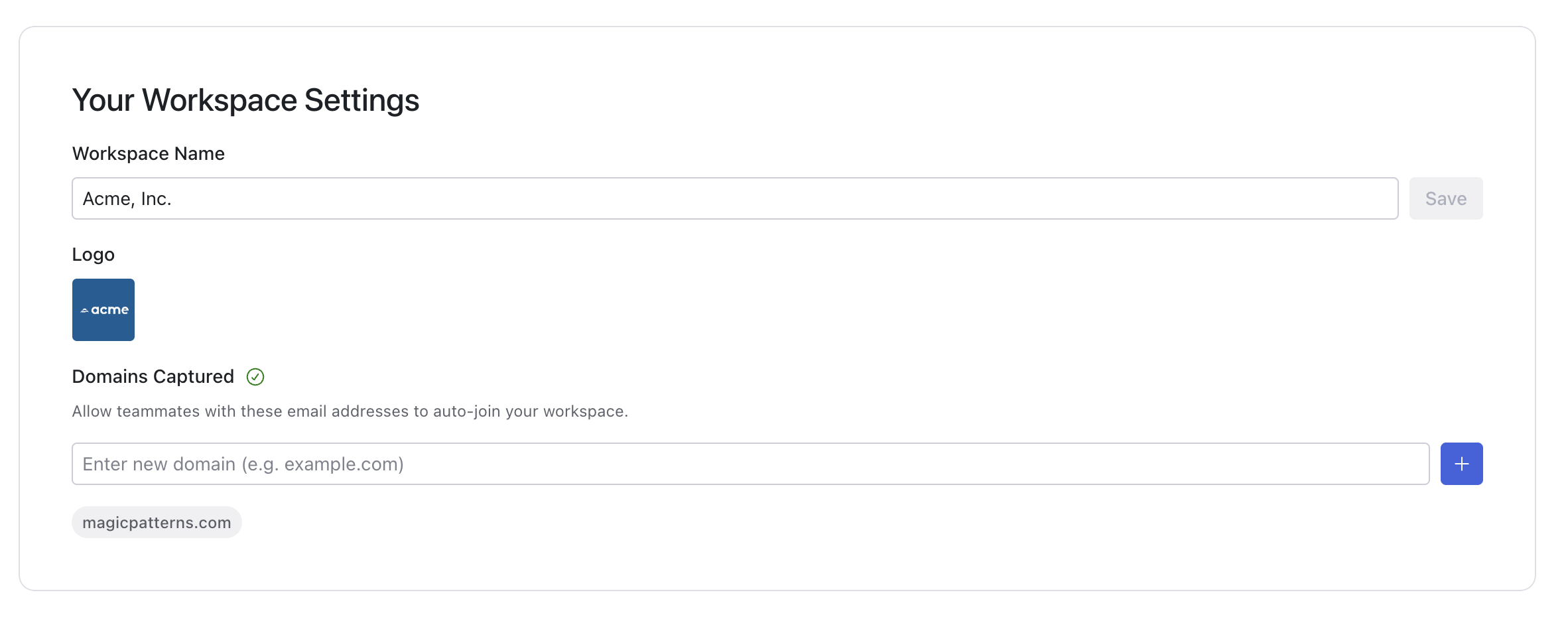 Domain capture automatically adds new users to your workspace when they sign up to Magic Patterns with an email address from your workspace’s domain.Contact support